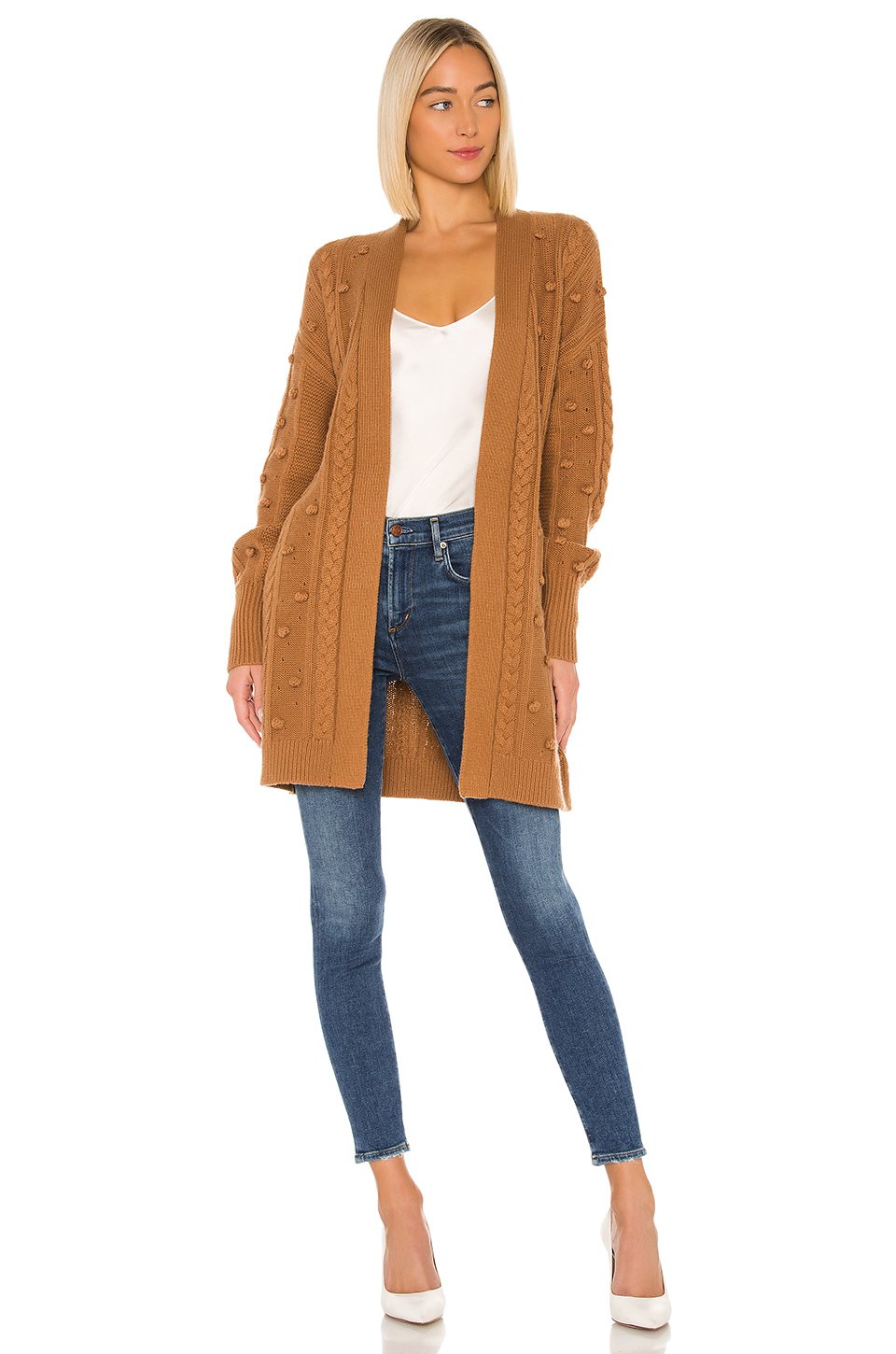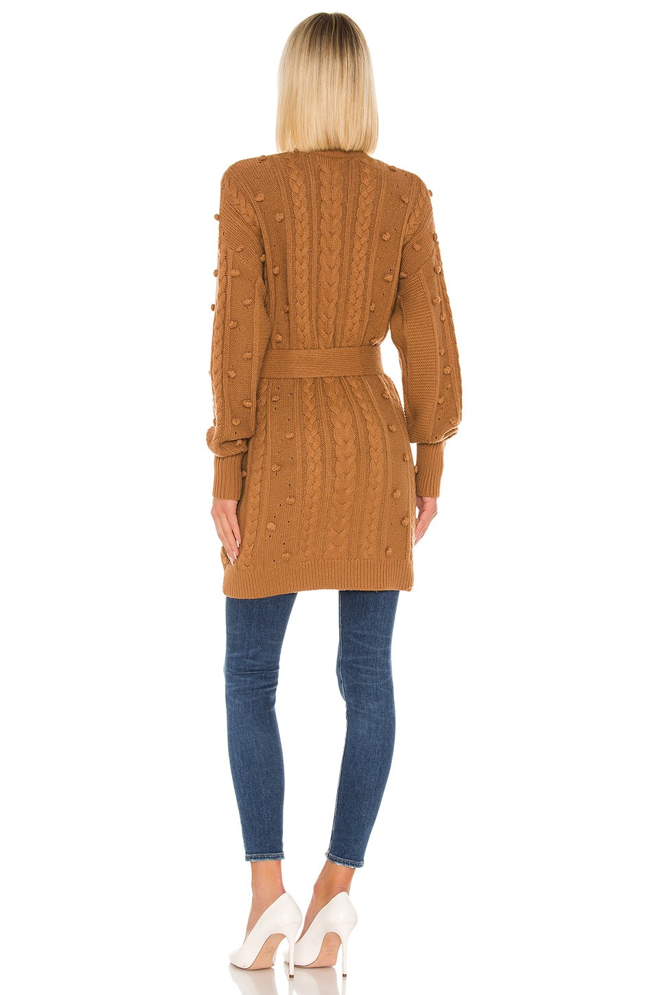 50% ウール, 50% コットンウエストで結ぶディテールのオープンフロントサイドシームポケットKnit fabric with cable knitポンポンのアクセント輸入品