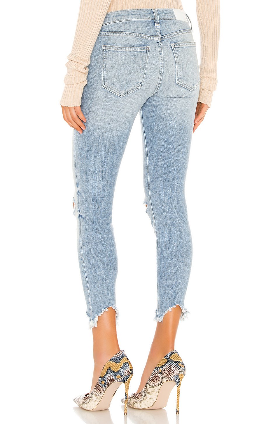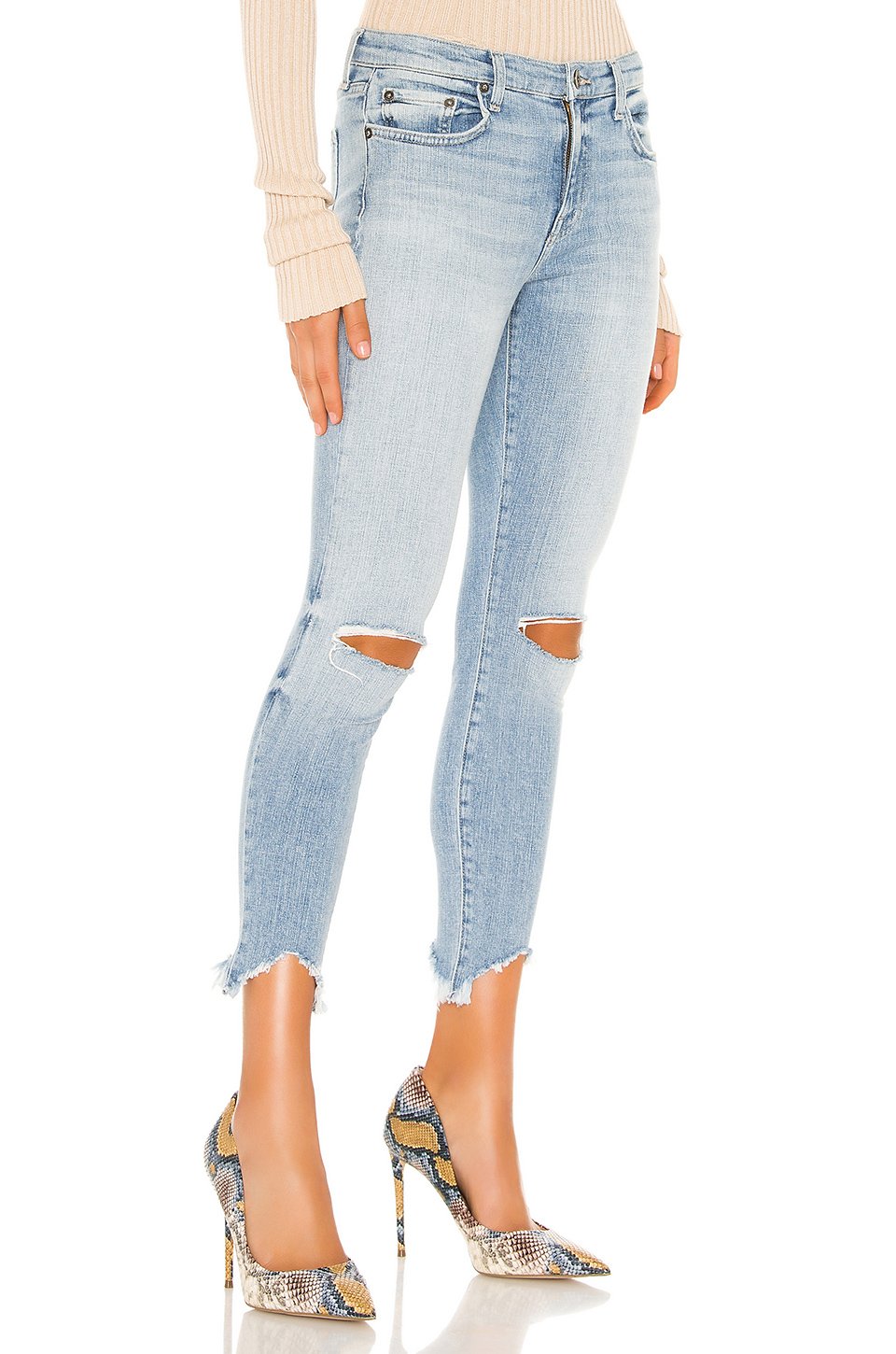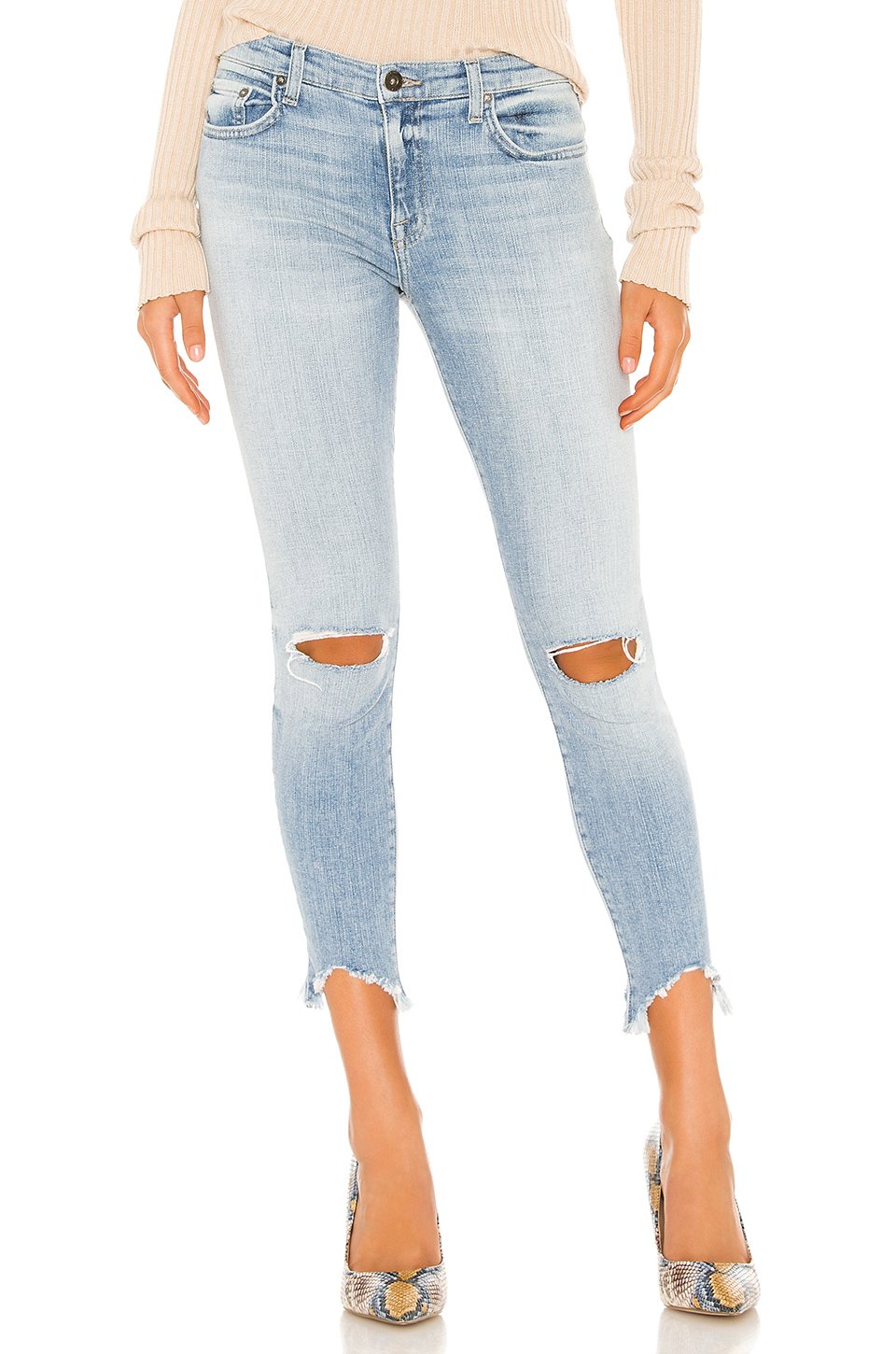 98% コットン, 2% スパンデックスジッパーにボタン留めクロージャー5-ポケットデザインダメージ加工Raw frayed step hem膝周り30 cm、裾周り25 cmアメリカ製
