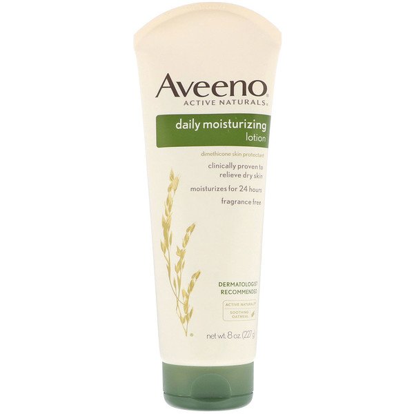 Dimethicone Skin Protectant Clinically Proven to Relieve Dry Skin Moisturizes for 24 Hours Fragrance Free Dermatologist Recommended For Over 60 Years Soothing OatmealThis dermatologist recommended unique oatmeal formula locks in moisture to help prevent and protect dry skin, providing temporary relief of the scaling and chapping associated with dry skin. The naturally nourishing, non-greasy lotion absorbs quickly, is noncomedogenic (won’t clog pores), and contains no added fragrance. Aveeno Daily Moisturizing Lotion leaves your skin soft, smooth and naturally healthy-looking.Clinically proven to: Relieve Dry Skin Moisture For 24 HoursSimply put, Active Naturals ingredients are derived from nature and uniquely formulated to reveal skin’s natural health and beauty.Essential Active Naturals: Skin-soothing natural colloidal oatmeal.Uses: Helps prevent and temporarily protects chafed, chapped or cracked skin. Helps prevent and protect from the drying effects of wind and cold weather.