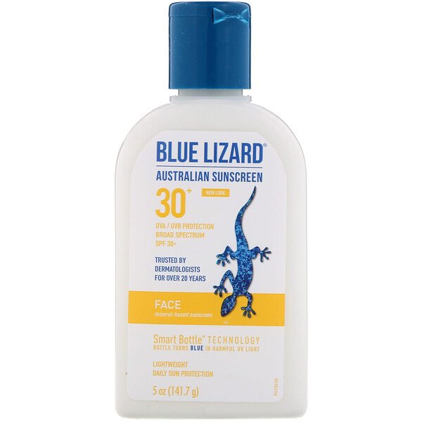 UVA/UVB Protection Broad Spectrum SPF 30+ Trusted by Dermatologist for Over 20 Years Smart Bottle Technology – Bottle Turns Blue in Harmful UV Light Lightweight Daily Sun Protection Mineral-Based Sunscreen for Daily WearDid You Know? Blue Lizard is named after a chameleon that changes color to protect itself… just like the lizard, your bottle will change color in harmful UV rays reminding you to protect yourself by applying sunscreen. It’s Genius!Mineral-Based SunscreenCombining mineral and chemical UV protectors for water-resistant performance you can trust.Paraben-FreeContains no fragrance or parabens making it ideal for sensitive skin.Powerful AntioxidantsFormulated with hyaluronic acid, caffeine and green tea to help soothe and protect.At Blue Lizard we love sunshine too. It enhances our mood, warms our bodies and keeps us healthy… however, sun exposure can also cause problems like premature aging of the skin and, worse still, cancer. So protection, real protection, is critical – which is fine by us because that is what Blue Lizard sunscreens have been designed to do.We are passionate about shielding you from the sun’s harmful UV rays with mineral-based products that are fun, easy-to-use and offer real protection for you and your family.That is why we have been trusted by dermatologists for over 20 years.Uses: Helps prevent sunburn and photodamage caused by UVA/UVB exposure. Higher SPF gives more sunburn protection.