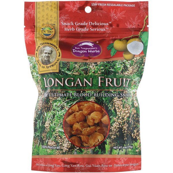 Stay Fresh Resealable Package Di Tao – Certified Authentic Source Snack Grade Delicious Herb Grade Serious Ron Teeguarden’s Seal of Approval The Ultimate Blood Building Snack 100% Natural Also Known as Long Yan, Long Yam Rou, Gui Yuan Rou or Dimocarpus LonganLongan, translated literally as “Dragon Eye” fruit, is a wonderfully delicious, fleshy fruits that is extremely popular in China as a snack as an ingredient in tonic tea and beverages.There is a saying in Chinese herbalism that “women are governed by blood”. As a result, women generally benefit significantly from blood tonics. Longan is a great blood tonic, often combined with blood tonics such as Dang Gui and Peony root to make blood-building teas and formulations.It is a great Qi tonic for building up your everyday energy. Consumed regularly, Longan boosts temporary energy as well as long term vitality, yet it is not a stimulant like caffeine. It gives you energy while stimultaneously relaxing you.Longan promotes tranquility. Longan has been found to promote deep, refreshing sleep.It can be used to enhance memory and steady the nerves by fortifying Blood and Qi.Longan is a famous beauty herb. Longan adds luster and beauty to the skin.Longan has a 2000-year reputation as a fantastic sex tonic for women. For that reason, Longan is considered a must for women who wish to be both beautiful and sensual.Longan’s effects are not hormonally driven. Longan is equally beneficial to men and women.Longan is believed to directly promote heart health by nourishing the heart tissues.