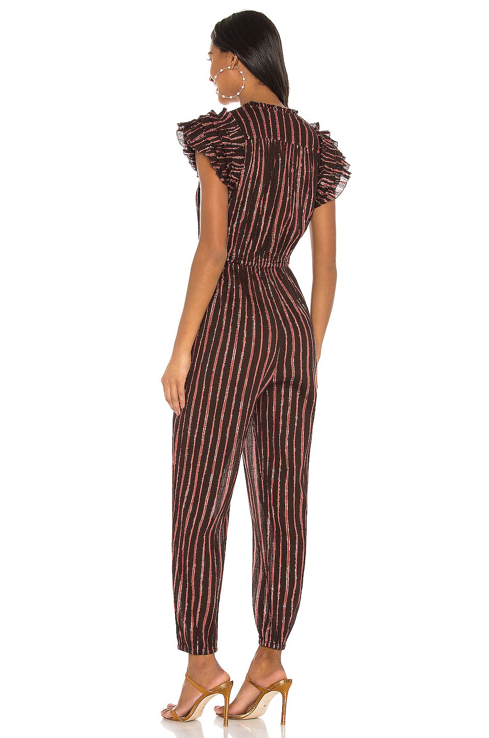 98% コットン, 2% ルレックスフロントの一部にボタン留め具ゴム入りドローストリングウエストサイドにスラントポケットラッフルトリム全面にメタリックスレッド輸入品