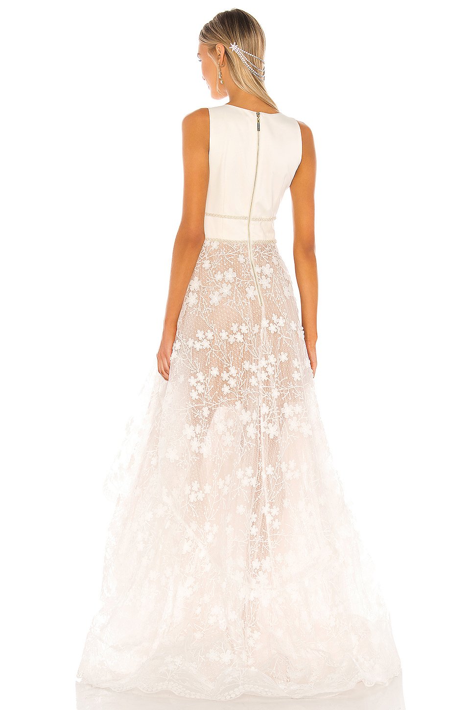 本体: 100% ポリエステル裏地: 100% ポリエステル, 5% エラスタンドライクリーニングのみ一部裏地付きSatin bodice with pearlized and bead embellishmentフローラルアップリケ付き、刺繍入りメッシュスカートバックジップクロージャー輸入品