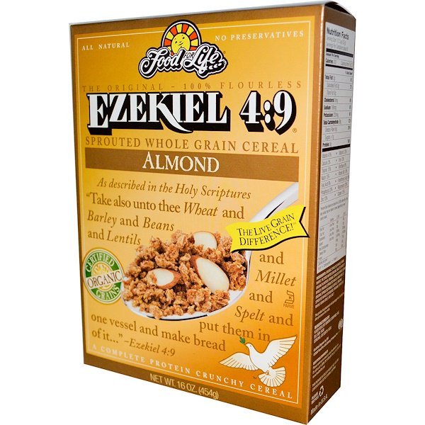 オリジナル100%小麦粉不使用の完全タンパク質エゼキエル4:9の発芽穀物シリアルは、聖書の「あなたは小麦、大麦、そら豆、レンズ豆、あわ、裸麦を取り、それらを一つの器に入れ、それでパンを作り、、、」(エゼキエル4:9)という一節からヒントを得ました。
