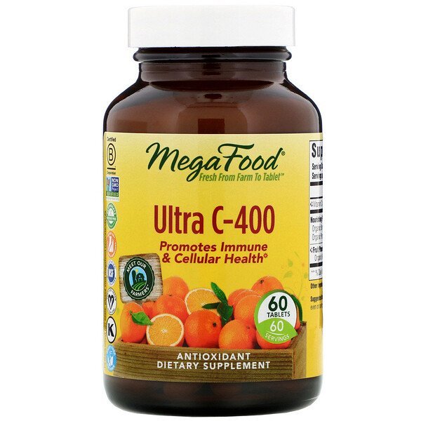 Business for GoodFresh From Farm To TabletPromotes Immune & Cellular Health Meet Our Farmers60 ServingsAntioxidant Dietary SupplementCertified B Corporation Non-GMO Project VerifiedGlyphosate – Residue Free Tested 125+ Pesticides & HerbicidesCertified NSF – Certified Gluten FreeCertified VeganKosherDairy Free – Soy Free MegaFood Ultra-C 400 contains FoodState Vitamin C delivered with real, organic oranges to help support your immune system. Colorful fruits and our unique herb blend provide added nourishment.