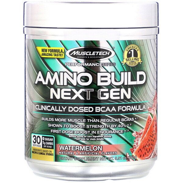 Superior Science. Superior Results.™Research & Development Performance SeriesAmerica’s #1 Selling Bodybuilding Supplement Brand‡Amazing Taste!Clinically Dosed BCAA FormulaBuilds More Muscle Than Regular BCAAs¹Shown to Boost Strength by 40%²First Dose Boost in Endurance³30 Servings0 Sugar – 1 g Carbs Per ScoopIngredients Based on Multiple Clinical StudiesNatural & Artificial FlavorsDietary SupplementClinically Dosed, Muscle- & Performance-Enhancing BCAA FormulaMuscleTech® researchers have taken their most powerful amino acid formula ever and made it even better. Introducing Amino Build® Next Gen – now with a new, advanced complex, featuring micronized BCAAs, clinically dosed betaine and powerful cell volumizers, plus coconut water, watermelon juice and new, delicious flavors. Unlike inferior products that are underdosed with gimmicky amino acids and no studies to back up their claims, Amino Build® Next Gen is backed by 4 different clinical studies that demonstrate its muscle-, strength- and performance-enhancing abilities.Builds More Muscle Than Regular BCAA Formulas¹Amino Build Next Gen features researched doses of many key ingredients that make it better than regular BCAA formula. In fact, test subjects who supplemented with the exact dose of betaine in 2 scoops of Amino Build Next Gen (2.5g) built 3.75 lbs of lean muscle in 6 weeks compared to 0.66 lbs by the placebo group. That’s over 5.5 times the muscle gained (vs. the placebo). Betaine has also been shown in a separate study to enhance muscle endurance.Cholewa et al., 2013. Journal of the International Society of Sports Nutrition 10(1):39.Hoffman et al., 2009. Journal of the International Society of Sports Nutrition, 6:7.Increase Strength by Over 40%²Amino Build® Next Gen is precisely formulated with a 4g dose of L-leucine (in 2 scoops), shown in a clinical study to help subjects increase their 5-rep max strength by over 40%!Ispoglou et al., 2011. International Journal of Sports Physiology and Performance. 6(1): 38-50.Enhances Endurance Performance with the First Dose³The 1g dose of taurine found in 2 scoops of Amino Build® Next Gen is clinically shown to improve performance in endurance athletes. And for a truly complete formula, precise doses of electrolytes were added to help replenish electrolyte stores that are depleted during your workout!Balshaw et al., 2013. Amino Acids. 44(2):555-561.‡MuscleTech® is America’s #1 Selling Bodybuilding Supplement Brand based on cumulative wholesale dollar sales 2001 to present.