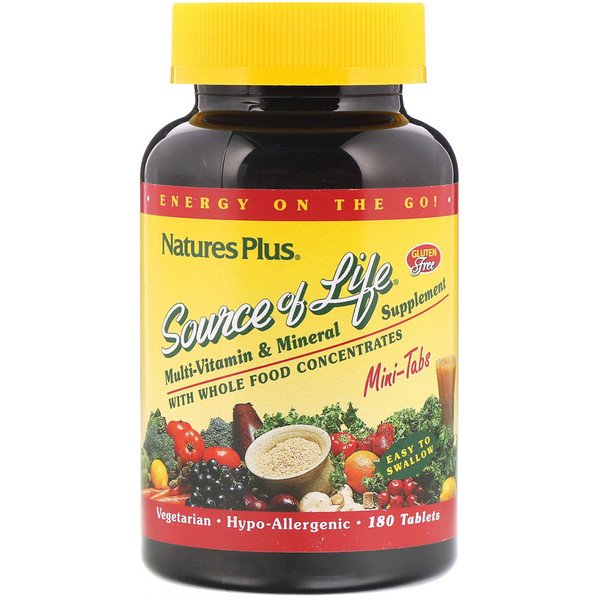 Nature’s Plus, ソースオブライフ、ホールフード濃縮物配合マルチビタミン&ミネラルサプリメント、ミニタブレット180粒