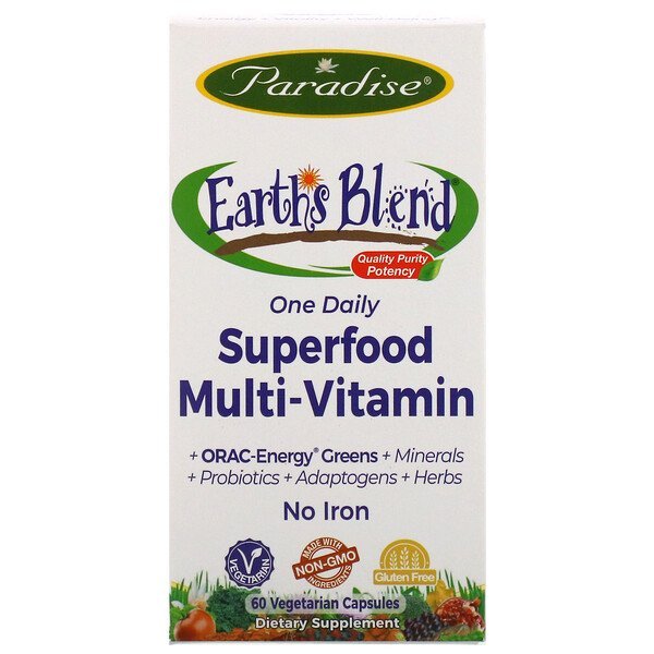 7 ServingsAntioxidant Power Fruits & VegetablesEnergy + Vitality + Well BeingQuality, Purity, PotencyOrac-Energy® Greens + Minerals + Probiotics + Adaptogens + HerbsVegetarianMade with Non-GMO IngredientsGluten FreeDietary SupplementEnhancing Nature’s Miracles ™Best of Supplements Award Winner – Better NutritionMade with Alkalizing Grass JuicesContains The Patented Original Greens FormulaQuality – Pure – PotencyParadise products have won 10 Best of Supplements Awards. We are dedicated to sourcing premium ultra pure ingredients that meet the highest standards of excellence.No Unnecessary FillersUnlike tablets that contain binders, fillers, magnesium stearate or stearic acid (which may inhibit absorption), our vegetarian capsules dissolve quickly in the digestive tract. We don’t add unnecessary fillers, binders, stearates, artificial colors, flavors or preservatives to our encapsulations.Ultimate AbsorptionWe provide the active, readily usable forms of vitamins B2, B6 & B12 while using the most soluble and absorbable mineral chelates (Krebs) as bound to citrate, aspartate-malate.Antioxidant Power of 7 Servings of Fruits & VeggiesBased on our original ORAC-Energy Greens formula, just one vegetarian capsule provides the antioxidant power of over 7 servings of fruits and vegetables (4000+ ORAC).Anti-Stress and Energy AdaptogensOur premium superfood multi-vitamin contains the highest quality adaptogenic extracts such as rhodiola, ashwagandha, holy basil, astragalus, schisandra and more. These anti-stress adaptogens help to support energy, focus, vitality and overall well-being.Nature Synergized™ with Real Whole-Food GoodnessParadise award winning Earth’s Blend® is truly a Nature Synergized™ superfood multi-vitamin. Our formula uses real whole-food goodness paired with vitamins, minerals, probiotics and herbs to go beyond mere deficiencies and help support overall whole system health.Superior Superfood Antioxidant SupportFree radicals are reactive species that have adverse effects on normal physiological functions. The five major types of free radicals, (hydroxyl, peroxyl, peroxynitrite, singlet oxygen, and superoxide anion), can be associated with a wide range of degenerative health conditions. Antioxidants can function as a vital line of defense against free radicals by blocking their attack on DNA, vital proteins, lipids and amino acids.Total ORAC (Oxygen Radical Absorbance Capacity) AssayRecent technology has resulted in a comprehensive new testing method called the Total ORAC Assay. With the development of the Total ORAC test, it is now possible to target and measure the effects of superfoods, vitamins and antioxidants on the full range of major free radicals found in the body. Paradise affirms its commitment to innovation and leadership in the multi-vitamin, superfood and antioxidant category by delivering a formula that attacks the full range of free radicals while going beyond mere deficiencies to help support overall whole system health.
