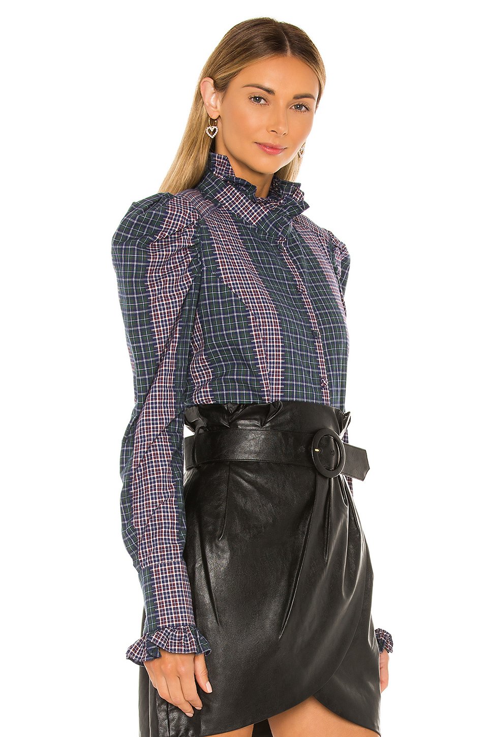 レーヨンブレンドドライクリーニングのみエクスポーズフロントボタン留めラッフルトリムExposed button cuffs