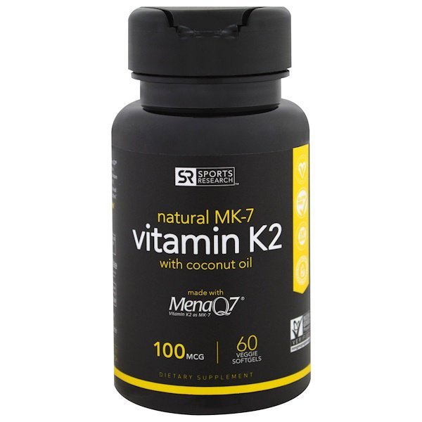 天然MK-7、ココナッツオイル配合 MenaQ7使用 MK-7としてのビタミンK2 栄養補助食品 ビーガン認定 グルテンフリー GMP(医薬品製造基準)認定 臨床的に証明済 非遺伝子組み換えプロジェクト認証Sports ResearchのビタミンK2はMenaQ7を特徴とし、ひよこ豆由来の非遺伝子組み換え型のMK-7です。