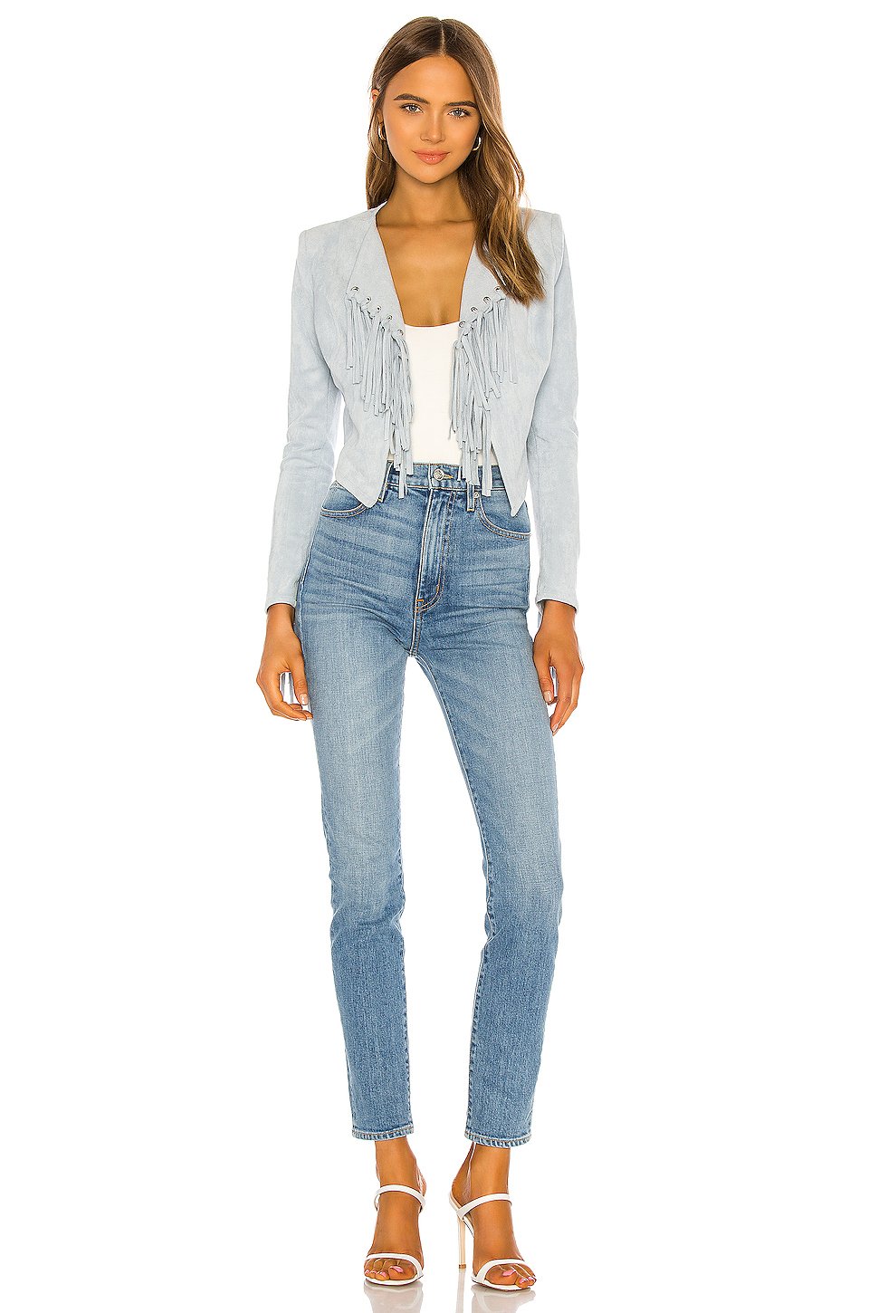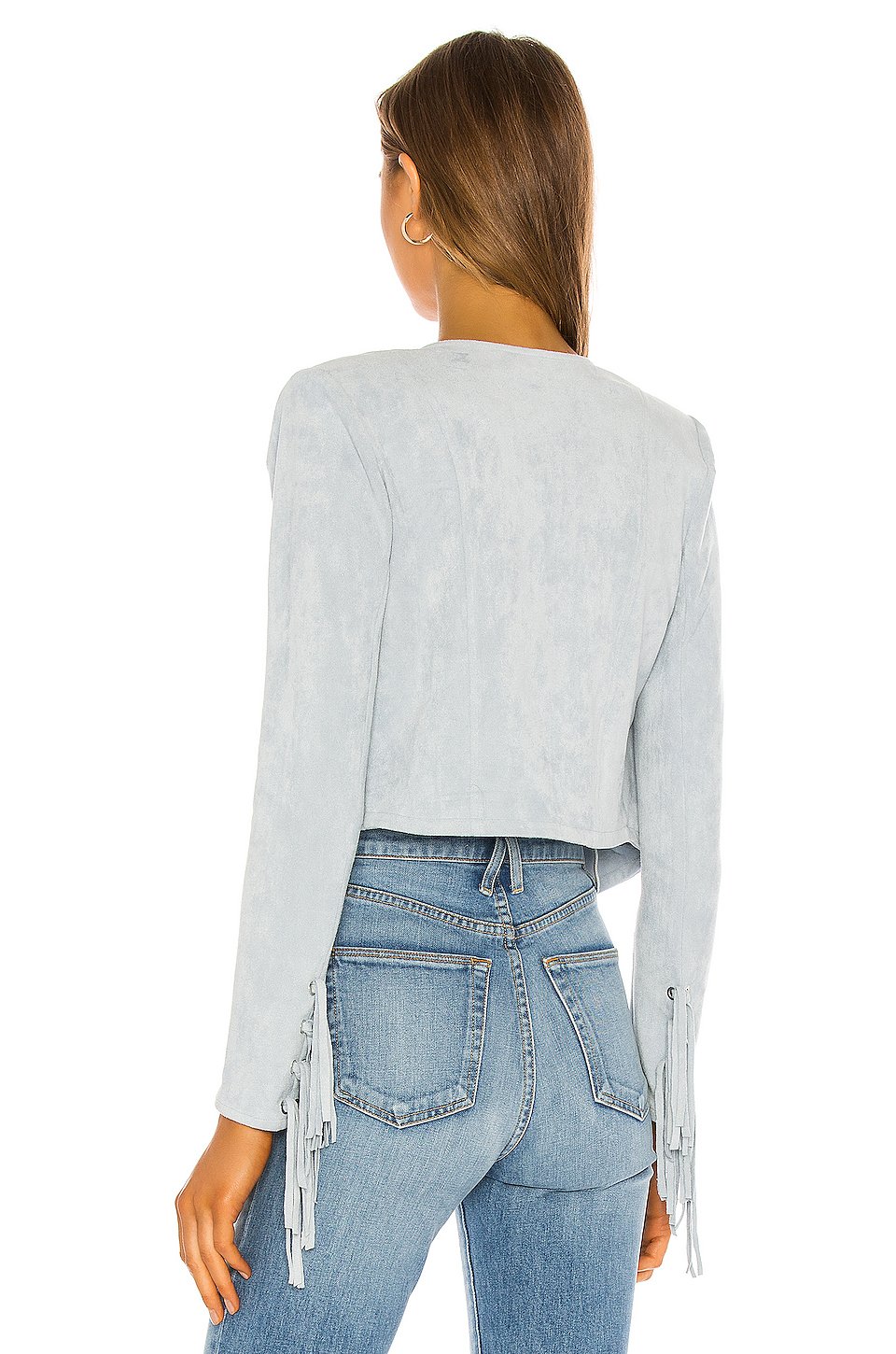 ポリエステル混紡ドライクリーニングおすすめオープンフロントパッド入りショルダーフリンジトリムフェイクスエード