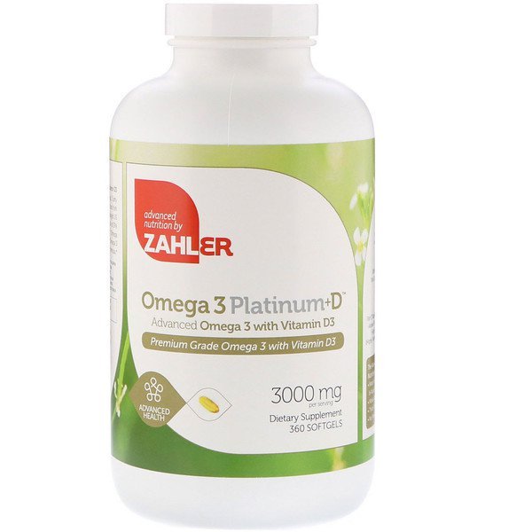 商品説明 Advanced Nutrition by Zahler Premium Grade Omega 3 with Vitamin D3 Advanced Health Dietary Supplement Feel Better, Everyday Kosher PareveThe Advanced Nutrition Advantage: Made from Algal Oil & Alaskan Pollock Fish Molecularly Distilled Third-Party Tested No AftertasteZahler’s Omega 3 Platinum+D contains Omega 3 fatty acids derived from Algal Oil as well as Alaskan Pollock fish which are sourced from certified sustainably managed US fisheries. With a concentration and optimal ratio of EPA and DHA, plus a robust dose of vitamin D, Zahler’s Omega 3 Platinum+D helps support healthy levels of Omega 3 fatty acids and vitamin D3 in one complete formula.Under strict supervision of Rabbi Sh. Stern and the Orthodox Union. ご使用の目安 Take 3 softgels daily with food or as directed by a healthcare professional. 成分その他 魚ゼラチン、グリセリン、精製水、バニラ味。 含んでいる:魚(ティラピア(魚ゼラチン)、アラスカポロック(フィッシュオイル – 高度に精製された))、大豆(フィッシュオイルで高度に精製された)。 この製品はGMP認証施設で製造されています。 警告 You may need additional supplements to support a healthy diet, consult your nutritionist for a formula that is right for you.Keep out of reach of children.Do not use if safety seal is damaged or missing.If pregnant, nursing or on medication, consult with your healthcare practitioner.Store in a cool, dry place. Refrigerate after opening. 免責事項 hfl8.comでは、製品情報や画像は最新のものを提供するように努めてはおりますが、メーカーでの急な変更の際に、サイトの更新に間に合わない場合があります。そのため、違うパッケージの商品が送られる場合がございますのでご了承下さい。当店の商品の新鮮さは保証致します。hfl8.comのサイト上に提示されている情報よりも、実際の商品にあるラベル、警告、使用方法を優先させてください。 メーカーのウェブサイトをご覧ください 補足の事実 サービングのサイズ: 3ソフトジェル 容器ごとのサービング: 120 1回あたりの量 %DV カロリー 30 総脂質 3 g 5%* ビタミンD 3(コレカルシフェロール2000 IUとして) 50 mcg 250% 魚と藻類の油のブレンド 3000 mg ** トリグリセリドとしてのEPA(エイコサペンタエン酸) 675 mg ** トリグリセリドとしてのDHA(ドコサヘキサエン酸) 600 mg ** *パーセントデイリーバリューは2,000カロリーの食事に基づいています。 **デイリーバリューは確立されていません。